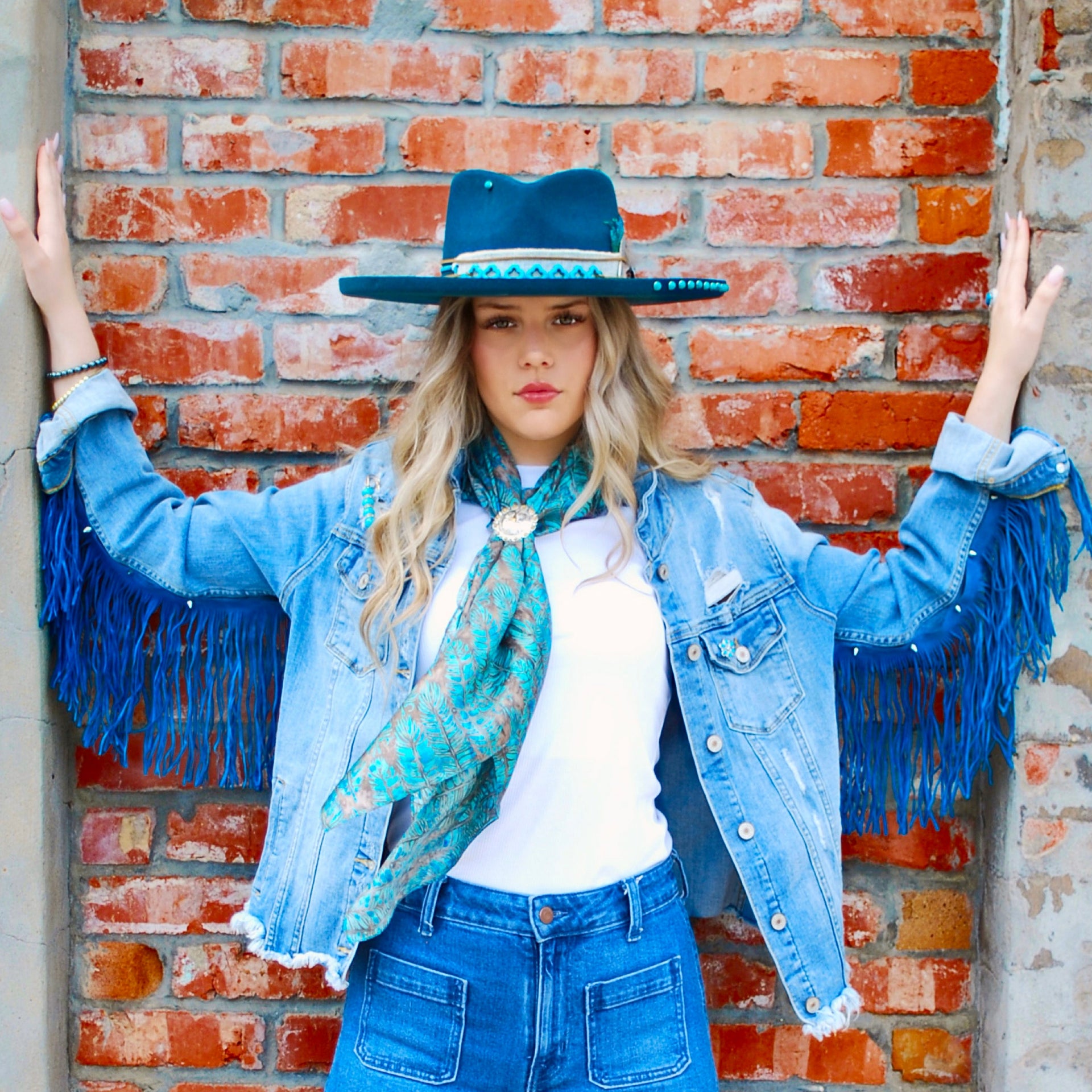 This beautifully designed recycled denim jacket is designed with contrasting Red and Turquoise! The denim is distressed with Turquoise Fringe with Silver stud rivets and red feathers on the collar that makes this jacket truly unique. Also designed with Cowboys and Tequila and turquoise patches, What Would Dolly Do Pin, turquoise grommets on the shoulder and truly ONE-OF-A-KIND and unique just like YOU!